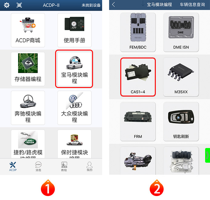 1:支持宝马 CAS1-CAS4+ 通过 OBD 方式进行里程复位和钥匙匹配。