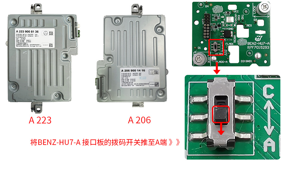 将BENZ-HU7-A 接口板的拨码开关推至C端 ▼