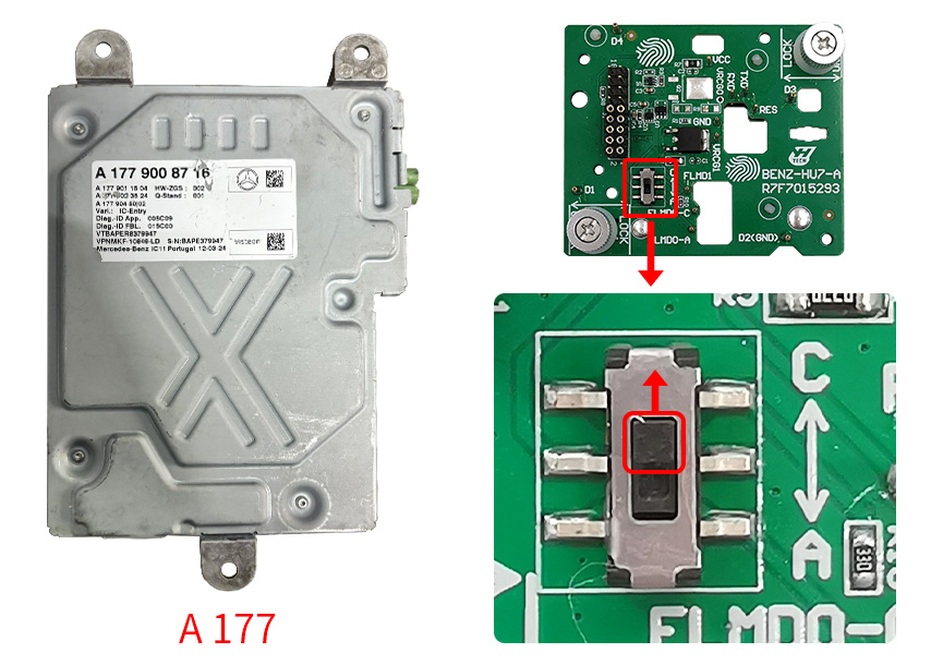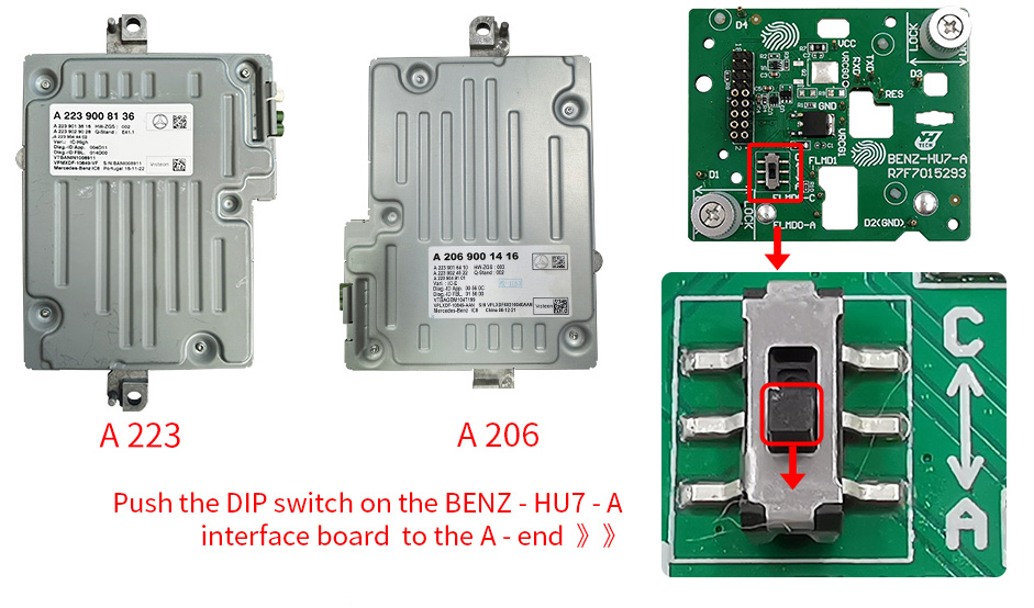 Push the DIP switch on the BENZ - HU7 - A interface board to the C - end ▼