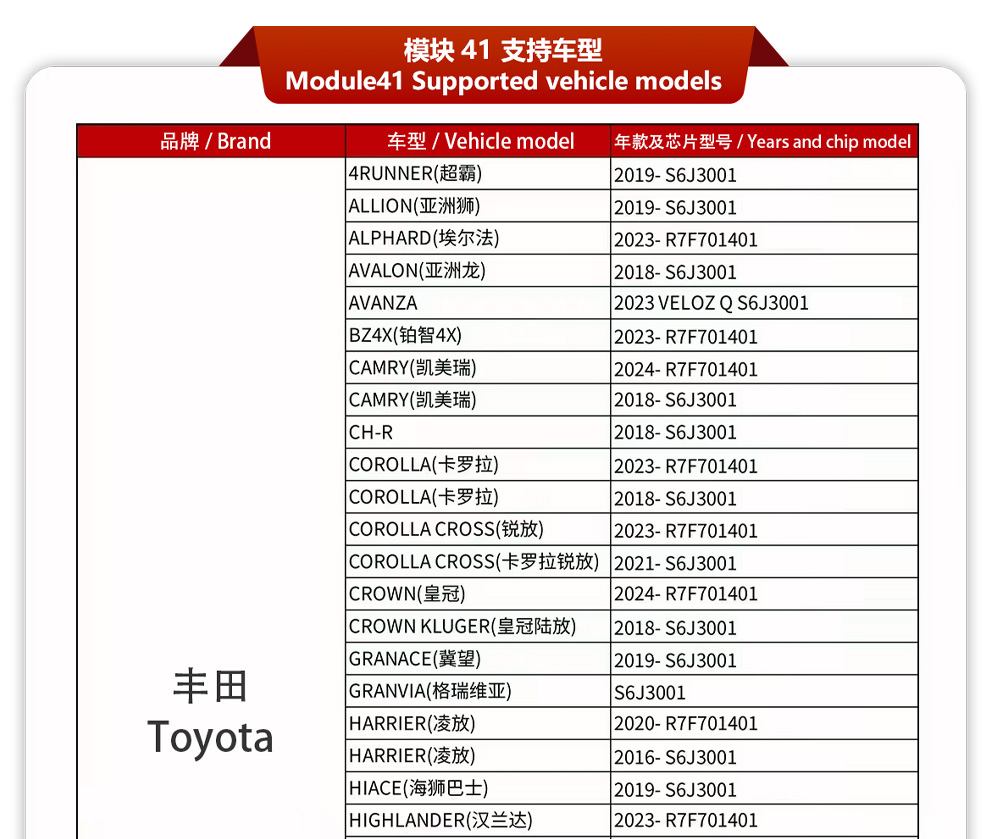 1:支持丰田S6J3001(2019-)加密/不加密芯片型号仪表OBD/CAN方式里程修复。 2:支持丰田R7F701401(2021-)加密/不加密芯片型号仪表OBD/CAN方式里程修复。 3:支持丰田R7F701441加密芯片型号仪表OBD/CAN方式里程修复。
